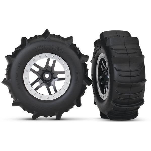Traxxas Tires & Wheels, Assembled, Glued (Sct Split-Spoke Satin Chrome Beadlock Style Wheels, Paddle Tires, Foam Inserts) (2) (4wd F/R, 2wd Rear) (TSM Rated)
