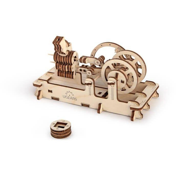 The Ugears engine can inflate baloons with the turn of a crank! This is a laser-cut wooden kit. Laser cutting allows for precision model parts that you can punch out by hand. Instructions come in English, German, Ukrainian, French, Polish, Spanish, Russian, Turkish, Italian, Chinese and Korean.