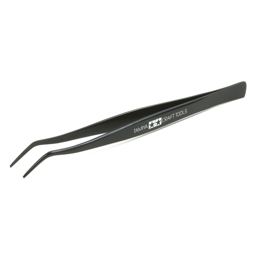 These angled tweezers are useful for handling small parts and adding decals to your models. The edges are rounded to prevent scratching. Made from stainless steel with a black cationic finish for long life.