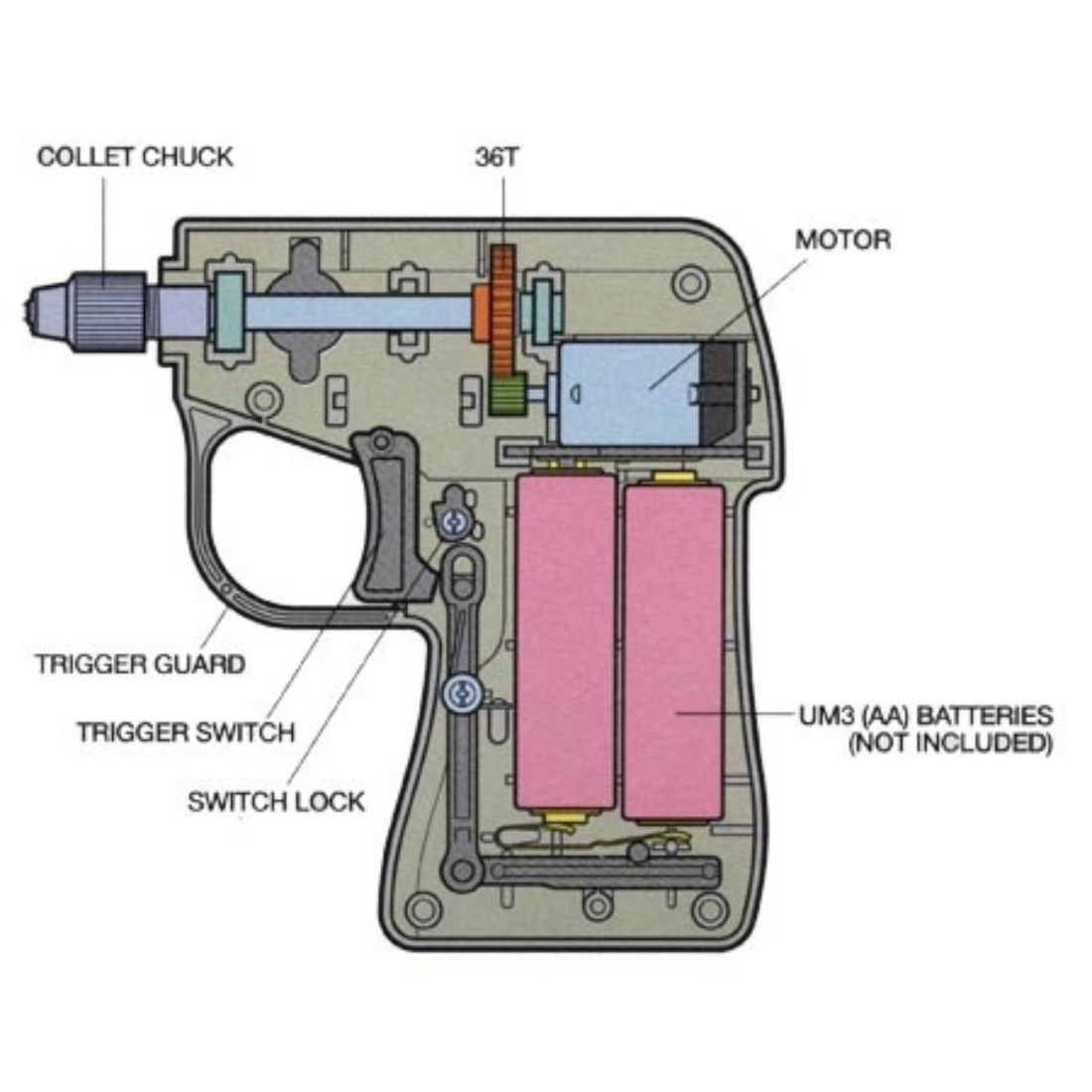 This is a ready-to-assemble electric handy router for use with plastic models and wood crafts. Trigger type router includes 1 round headed router bit. Requires two R6/AA/UM3 type batteries (available separately). Get more bits for this router here!