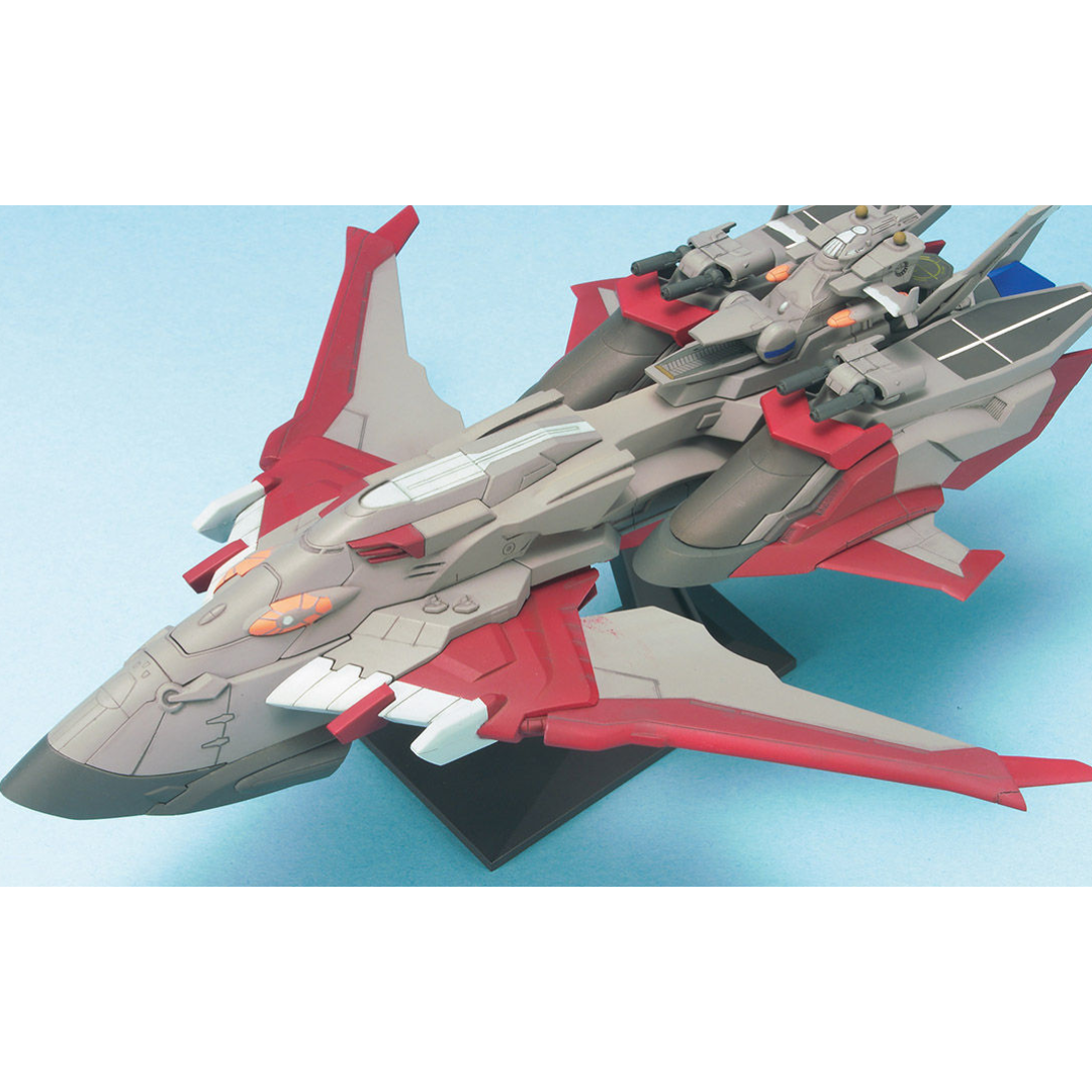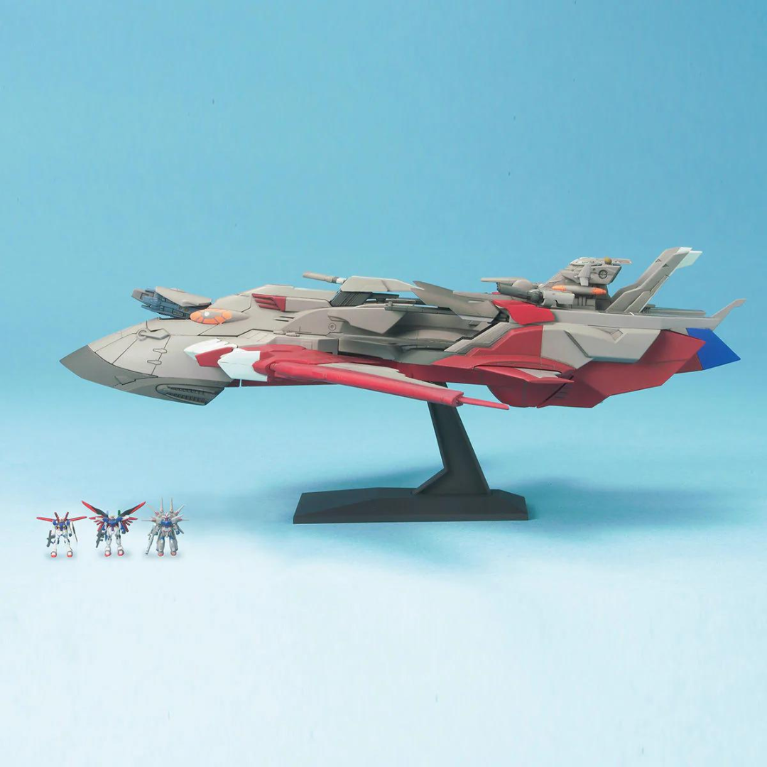 This kit requires paint and glue. The LHM-BB01 Minerva from Gundam SEED Destiny is molded in gray and red. It comes with a display stand and three 1/1700 scale figurines. It features some moving parts like turrets and cannons, but is largely static.