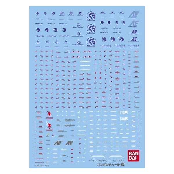 A sheet of waterslide decals for Gunpla kits by Bandai.