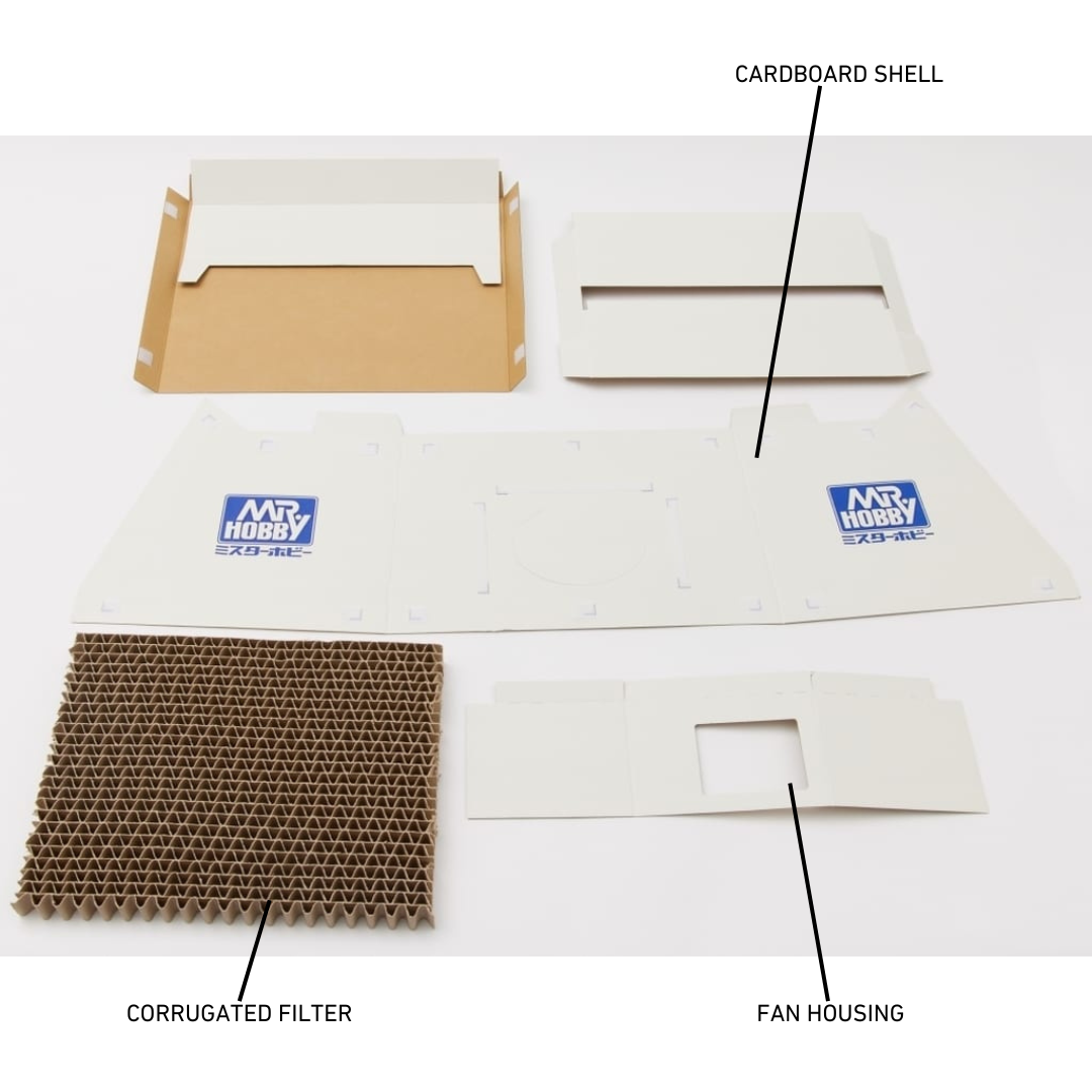 This fold out cardboard spray booth is perfect for hobbyists on a budget or to save space. It comes with a corrugated carboard filter that can easily slide out to be replaced, and a slot at the back to attach an exhaust fan and hose (both sold separately - any exhaust fan will do).