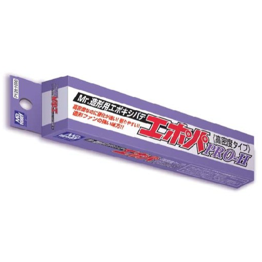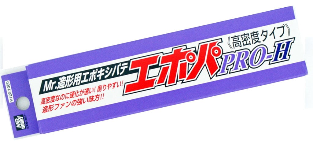 Two part epoxy putty from Mr. Hobby. It is suitable for detailed moulding, shaping thin parts or providing a smooth surface on plastic parts. It is a fast drying type of putty despite its high density. It requires 3 to 4 hours to fully dry, and you can cut it 1 hour after moulding.