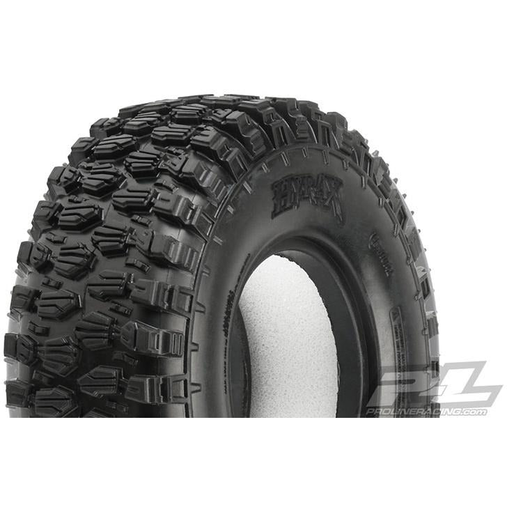 This is a pair of Class 1 Hyrax 1.9" Rock Crawling Tires. The future of Class1 Tire Performance has arrived with Pro-Line's all-new 1.9" (4.19" OD x 1.4" Width) Hyrax Tire! Designed from the ground up for maximum grip on the toughest terrain, the Class 1 legal Hyrax tire is ready for anything your Scale Adventure might throw at you. The Hyrax features an aggressive and open tread pattern with each tread block containing multiple Sipes for incredible tread flex while still looking great on a Scale Rig. The highly detailed connected tread on the sidewall of the Hyrax extends out for unmatched side-hilling performance and the futuristic stepped tread blocks create even more forward gripping edges that dig into slick rock like no other scale tire Pro-Line has produced to date! The Hyrax is made from Pro-Line's Legendary G8 material, so you know it provides performance you can depend on.