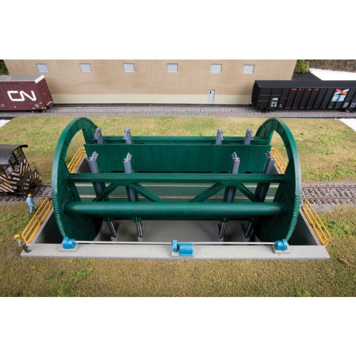 The Walthers Cornerstone Rotary Dumper is a great addition to all types of heavy industries that need to unload large quantities of raw materials in a hurry. Paper mills like Superior Paper that don't have their own debarking or chipping facility receive shipments of wood chips by train. They're unloaded quickly by spinning a clamped rail car around, dumping the load into a pit beneath the tracks. The wood chips are moved by conveyors and often piled high for storage outside the mill. At steel works, they handle hoppers of limestone as well as coal for the coke ovens. Paper mills use them to empty woodchip cars. Powerplants make quick work of unloading unit trains without uncoupling cars. In any setting, this detailed model captures the look of the real thing for your layout. Detailed styrene components simulate the heavy steel construction of the prototype and include positionable turning machinery.