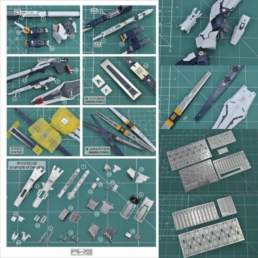 This is a set of metal photo-etch parts for the RG RX-93 v (Nu) Gundam. The metal pieces can be glued onto the kit and painted over while retaining full functionality. Original water slide decals are included.