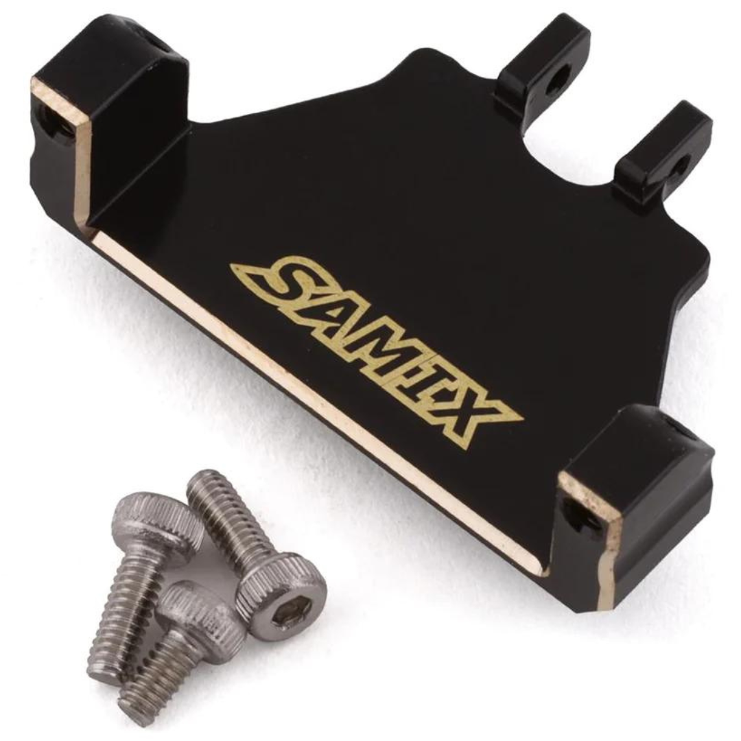 The Samix SCX24 Brass Servo Mount is a heavy duty servo mount option for the SCX24 family of trucks that allows the use of stronger, more precise and more durable mini servos. Plus, this mount adds 7 grams of unsprung weight to the front axle to improve the front/rear weight bias and help to offset the weight of a heavy body.