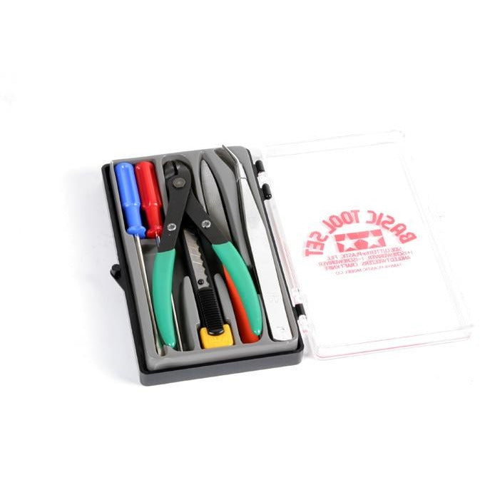 This is a basic tool set from Tamiya Plastic Models. It comes with nippers, file, a retractible knife, tweezers and two small phillips scredrivers.