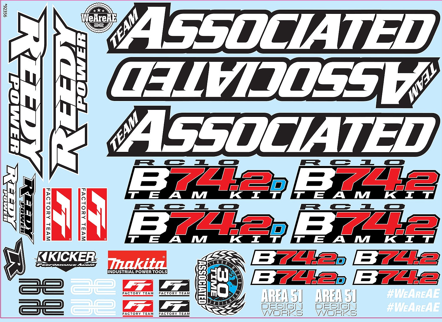 Team Associated RC10B74.2 Decal Sheet. This is a replacement decal sheet intended for the Team Associated B74.2 and B74.2D vehicles. Package includes one decal sheet.