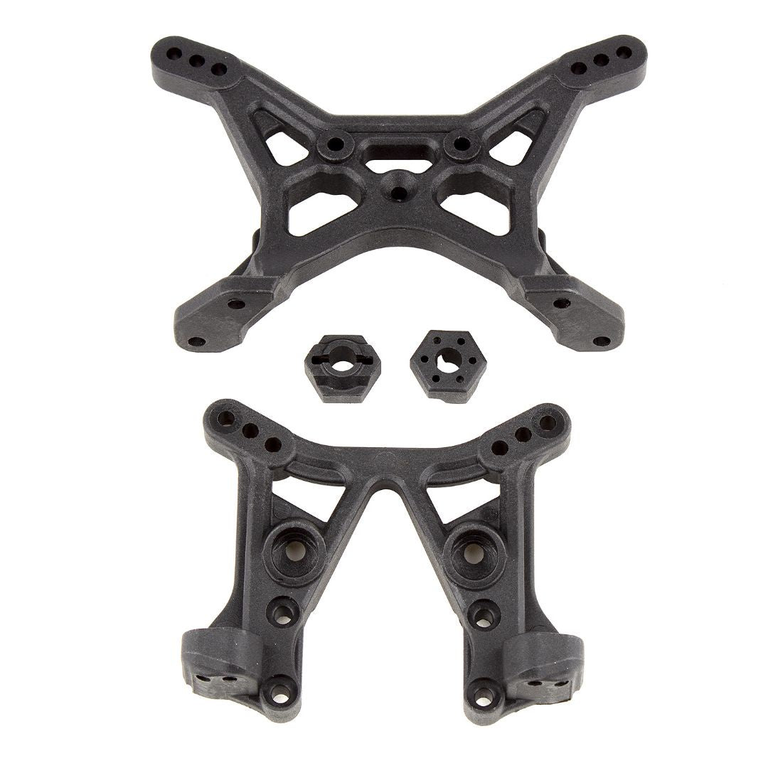 Team Associated SR10 Shock Tower Set. Package includes replacement shock towers and wheel hexes.