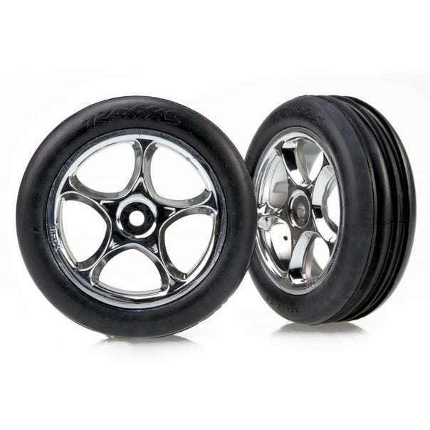 This is a pack of two Traxxas Alias Front Tires, mounted on Tracer 2.2" Wheels. These are the stock tire included with the Traxxas Bandit and feature a classic rib tread pattern. Choose from a Black Chrome or Chrome finish.