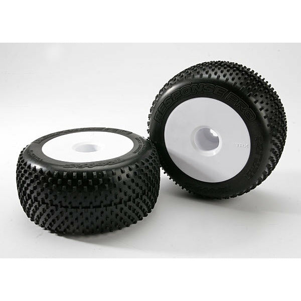Traxxas set of Response Pro 3.8 short knobby design tires and white dish wheels with foam inserts. Soft rubber compound designed for racing. Directional and asymmetrical tread design that maximizes traction on a variety of surfaces. White nylon dish wheels are included.