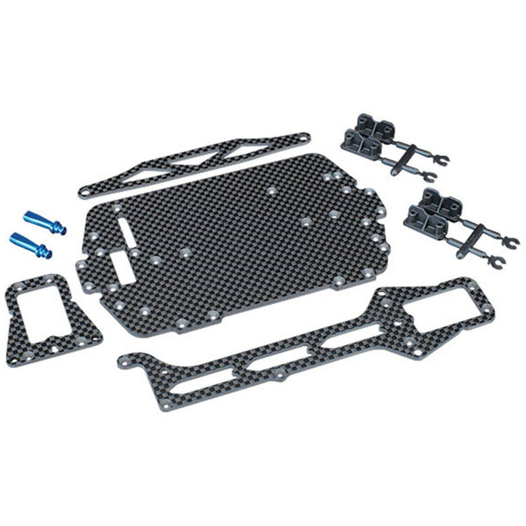 A carbon fiber conversion kit for La Trax series vehicles containing: chassis, upper chassis, battery hold down, adhesive foam tape, and required hardware.