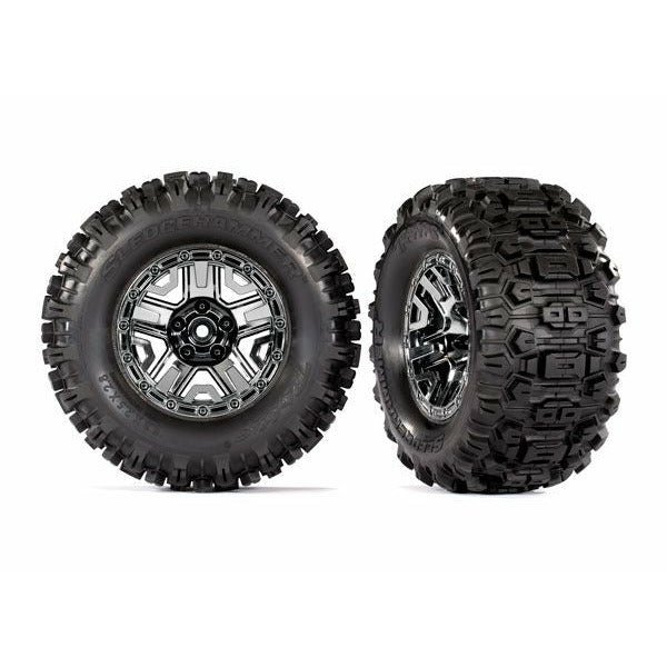 This pair of glued assembled Sledgehammer tires and black chrome 2.8" wheels with foam inserts by Traxxas are TSM rated.