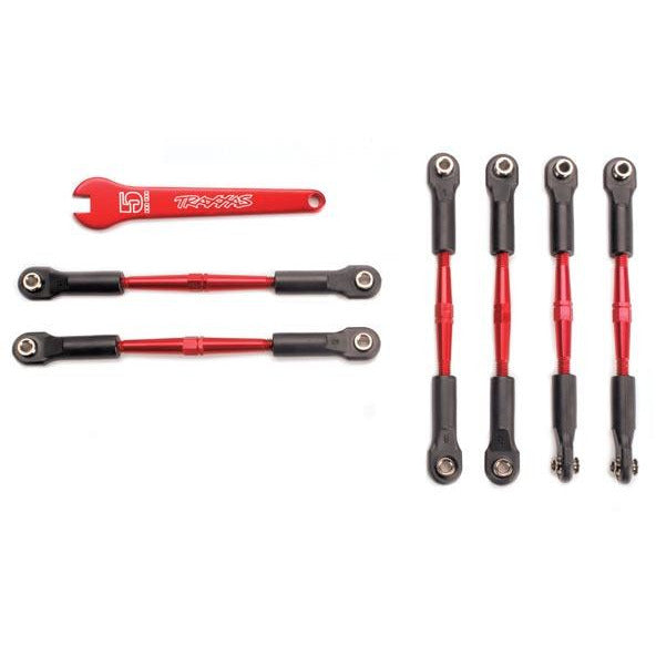 Traxxas¢ aluminum turnbuckles make it possible for R/C hobbyists to dress up their Jato¢¢ and save weight at the same time! These turnbuckles come in a brilliant, fire-red anodized finish and include a 5mm aluminum wrench that prevents marring the finish. Traxxas aluminum turnbuckles save almost 19 grams over the stock steel turnbuckles and are 35% lighter than titanium. Traxxas manufactures these turnbuckles from high-grade 7075-T6 aluminum to provide ample bending stiffness.