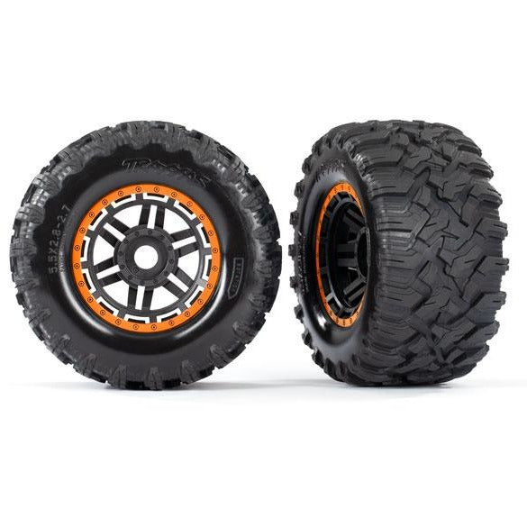 Traxxas Tires & wheels, assembled, glued (black, orange beadlock style wheels, Maxx MT tires, foam inserts) (2) (17mm splined) (TSM rated