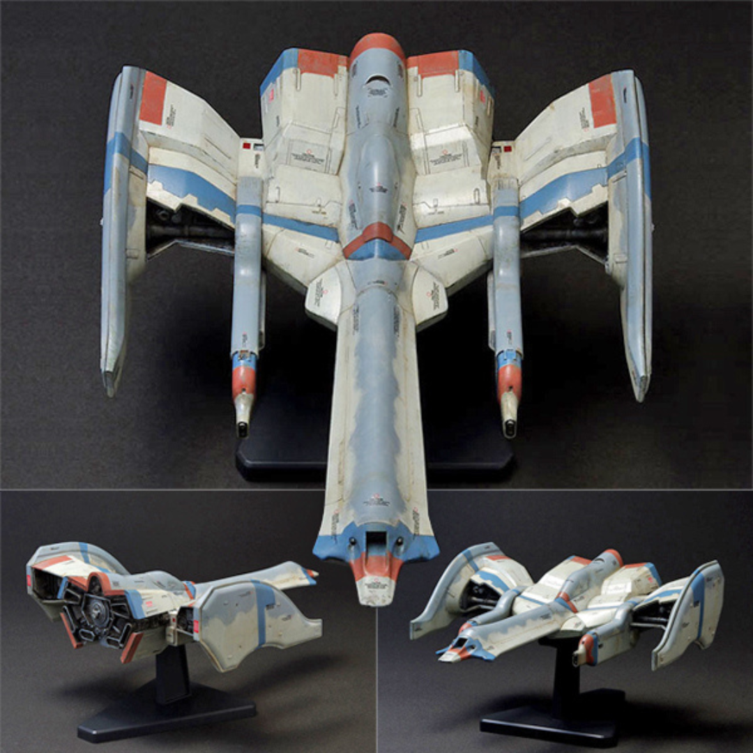 The ship from the famous video game Galaga as reimagined by artist Kow Yokoyama, whose work is popularized in the Mashinen Krieger model kit line.