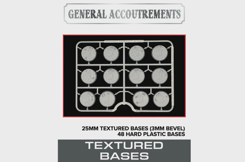 This box includes 48 textured hard plastic 25mm bases with a 3mm height and bevel edge. Whether you want to field your models on desert, gravel, mud, snow, or an alien world these bases have you covered. Skip the putty and go straight to painting!